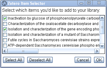 If you are importing a large number of items from scholarly databases (e.g., if you are conducting a systematic review), databases such as Google Scholar, ProQuest, Web of Science, and others, may lock you out if you use the Zotero save button too frequently or with too many items at once. In such cases, it is better to export the items as a batch in one of the standardized formats listed above (e.g., BibTeX and RIS are common choices) and import this file into Zotero. Web of Science and ProQuest offer the ability to select multiple items from a search results list and export as a batch to various formats. In Google Scholar, you need to first save the items to your Google Scholar library (using the ☆ icon in the search results), then select and export them from the Google Scholar “My Library” page.