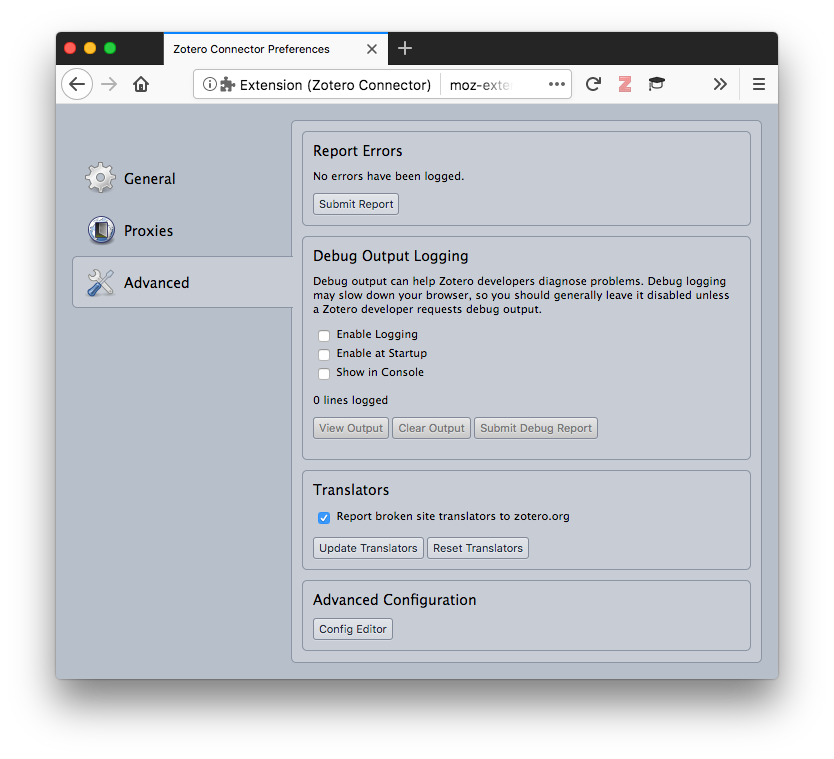 - Advanced Configuration: The Config Editor options are not useful for general troubleshooting and should only be used if instructed by the Zotero developers.