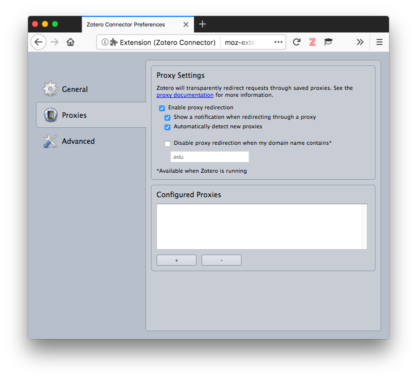 - Zotero's proxy redirection is enabled by default. Uncheck this option to disable proxy redirection. You can do this temporarily and your proxy settings will remain saved. Do not use this option if you no longer have access to the saved proxies. In that case, delete those settings by selecting them in the “Configured Proxies” box and pressing the minus (-) button below it.
