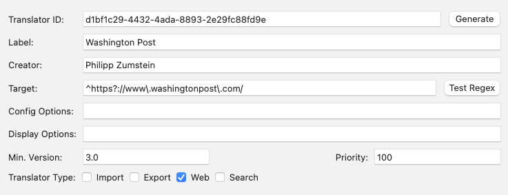 The unique internal ID by which Zotero identifies the translator. You must use a stable GUID, as the translator ID is used for automatic updating of translators, and for calling translators within other translators. Click “Generate” to create a new GUID (for instance, when making a copy of an existing translator). - Label (