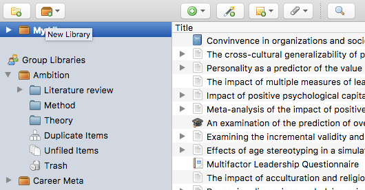 If you have enabled data syncing and are a member of a group with an enabled library, the group library will appear in Zotero's left pane. Items can be dragged into a group from My Library or another group and viewed or edited by other group members, if their permissions allow it. To create a collection, right-click on a group library and select “New Collection…” or “New Saved Search…”.